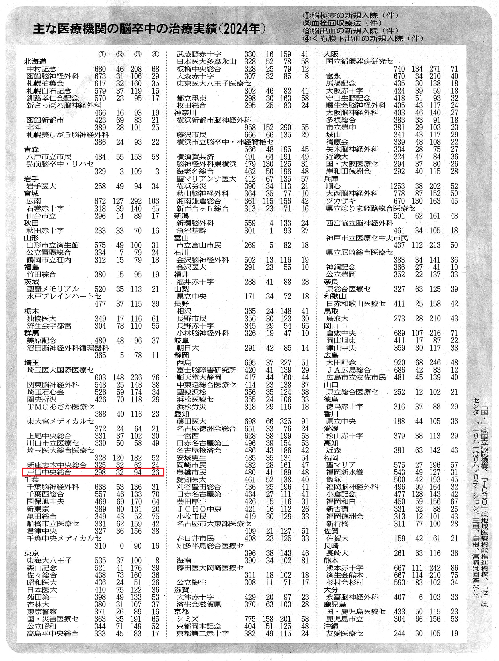 読売新聞「病院の実力<脳卒中>全国版」(2025年11月16日17面)に、脳卒中の治療実績(2024年)がある医療機関として当院が掲載されました。
