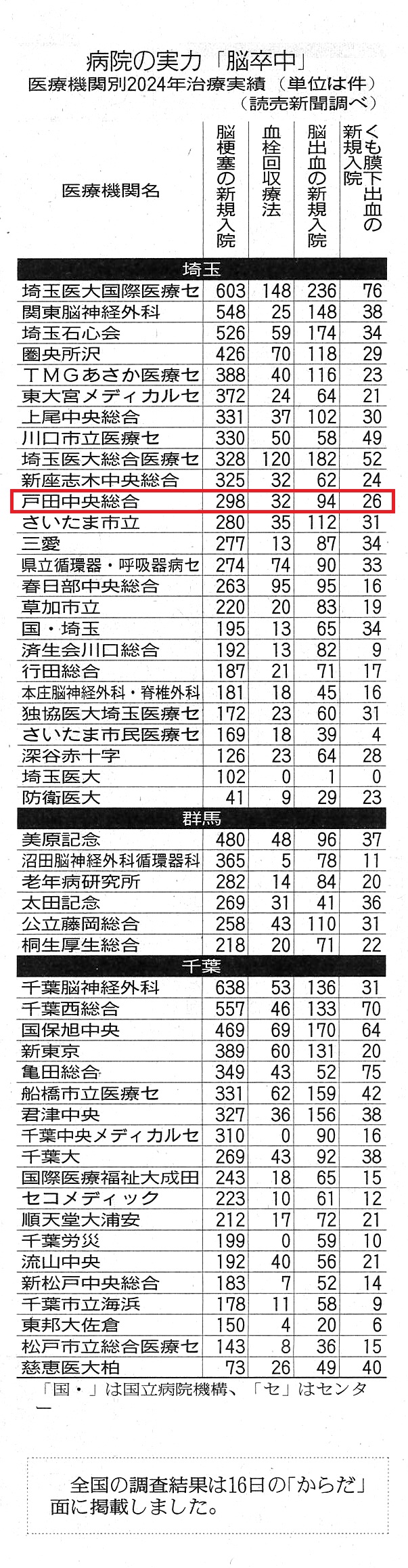 読売新聞「病院の実力<脳卒中>埼玉編」(2025年11月23日 地域24面)に、脳卒中の治療実績(2024年)がある医療機関として当院が掲載されました。