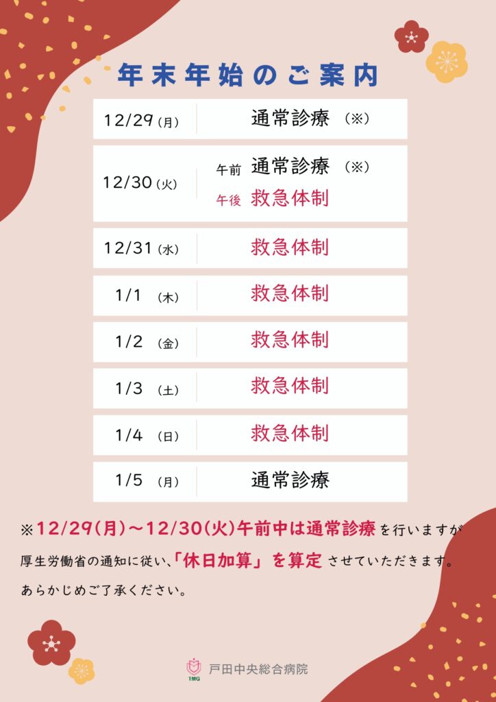 年末年始の診療体制について、下記の通りご案内いたします。