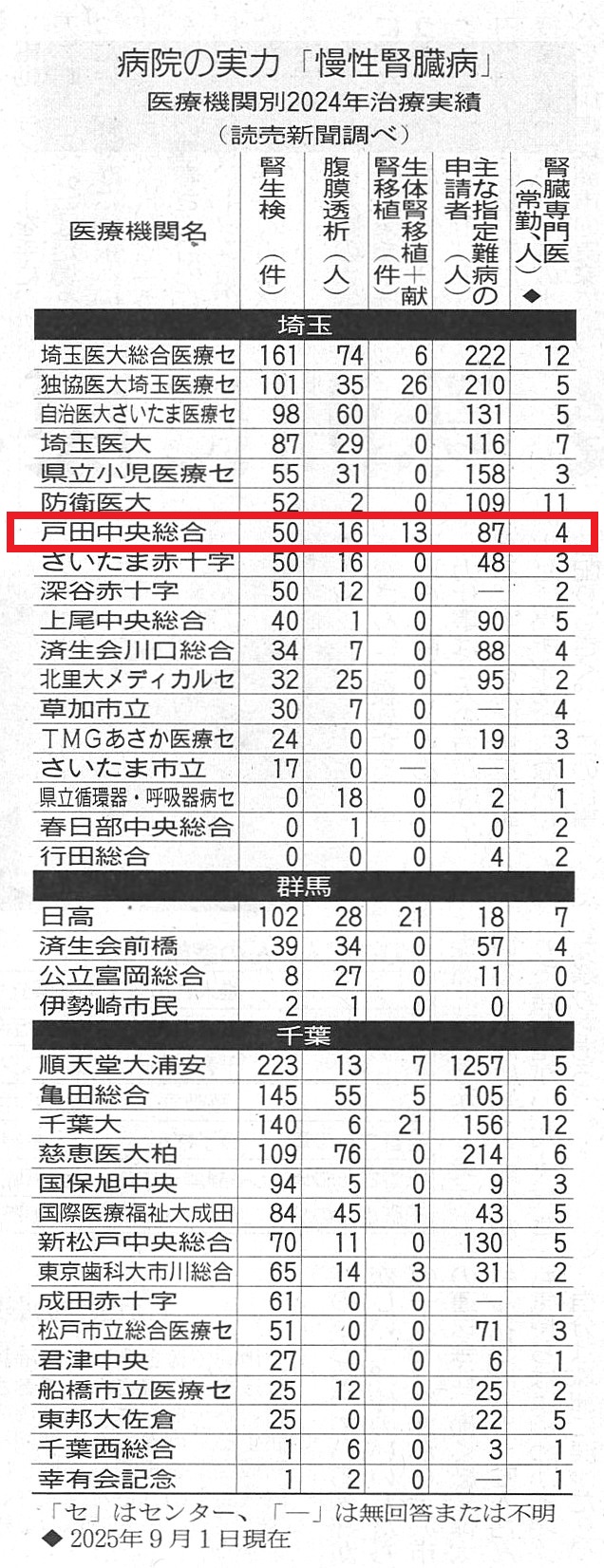 読売新聞「病院の実力<慢性腎臓病>埼玉編」(2025年12月28日 地域27面)に、脳卒中の治療実績(2024年)がある医療機関として当院が掲載されました。