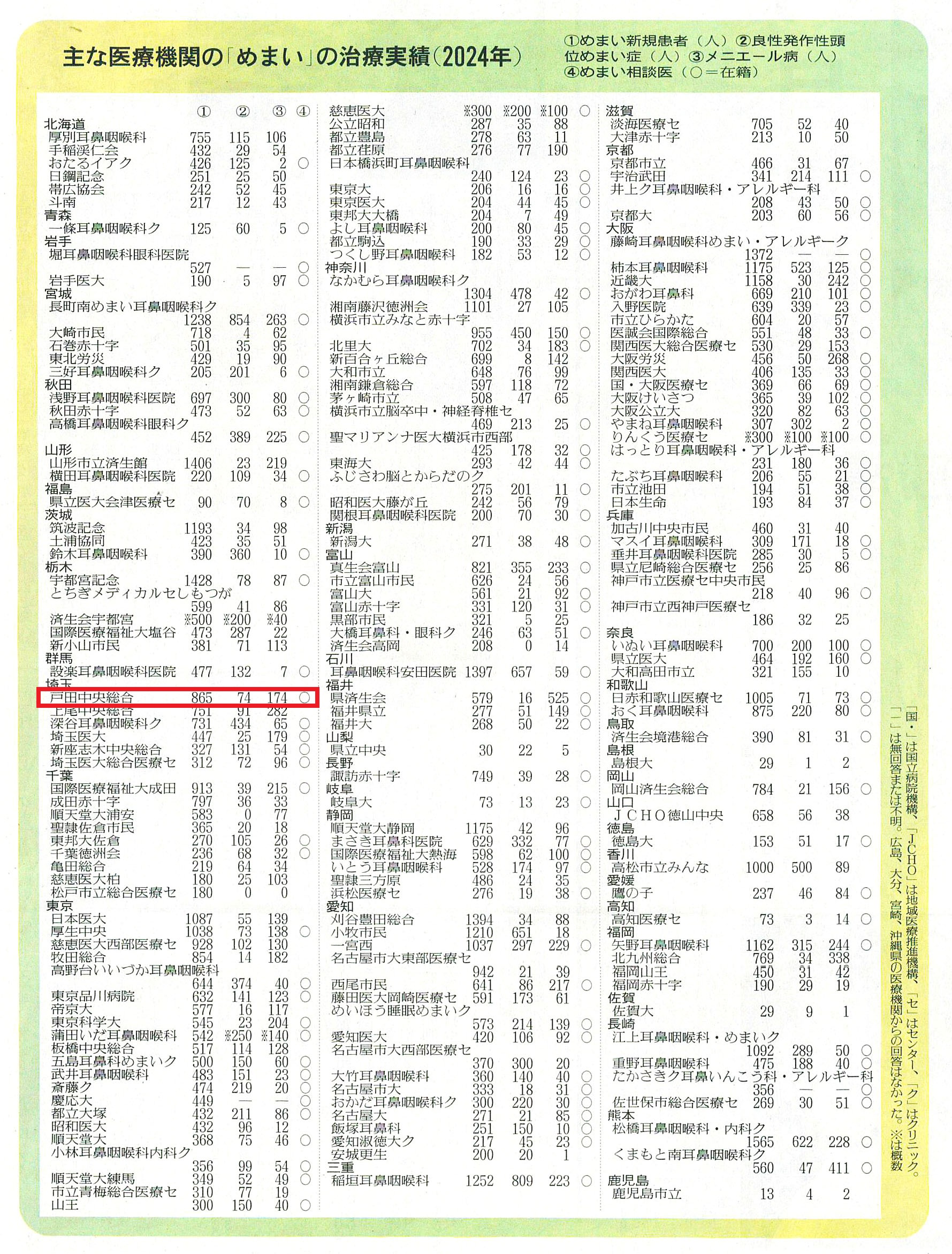 読売新聞「病院の実力<めまい>全国版」(2026年4月19日15面)に、めまいの治療実績(2024年)がある医療機関として当院が掲載されました。